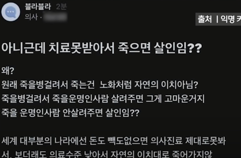 출처 : [뉴스 ‘꾹’] “치료 못받아 죽는 게 살인?"..'의사 맞냐!' 쏟아진 공분 (2024.02.22/MBC뉴스)